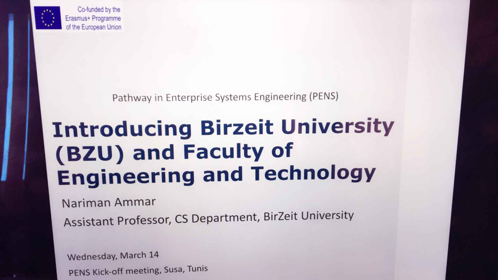 The PENS Project kick off was organised at – Tunisia on March 2017, and organized by Birzeit University, the project coordinator and hosted by SU, and participation form all partners. The kick-off meeting aimed to physically introduce the project consortium partners to each other, to clarify the roles and responsibilities of each partner in the project, to formulate the steering committee of the project, to introduce important financial issues regarding the project, to define collaboration mechanism and tools within the project, and to agree on a working plan for the next six months.